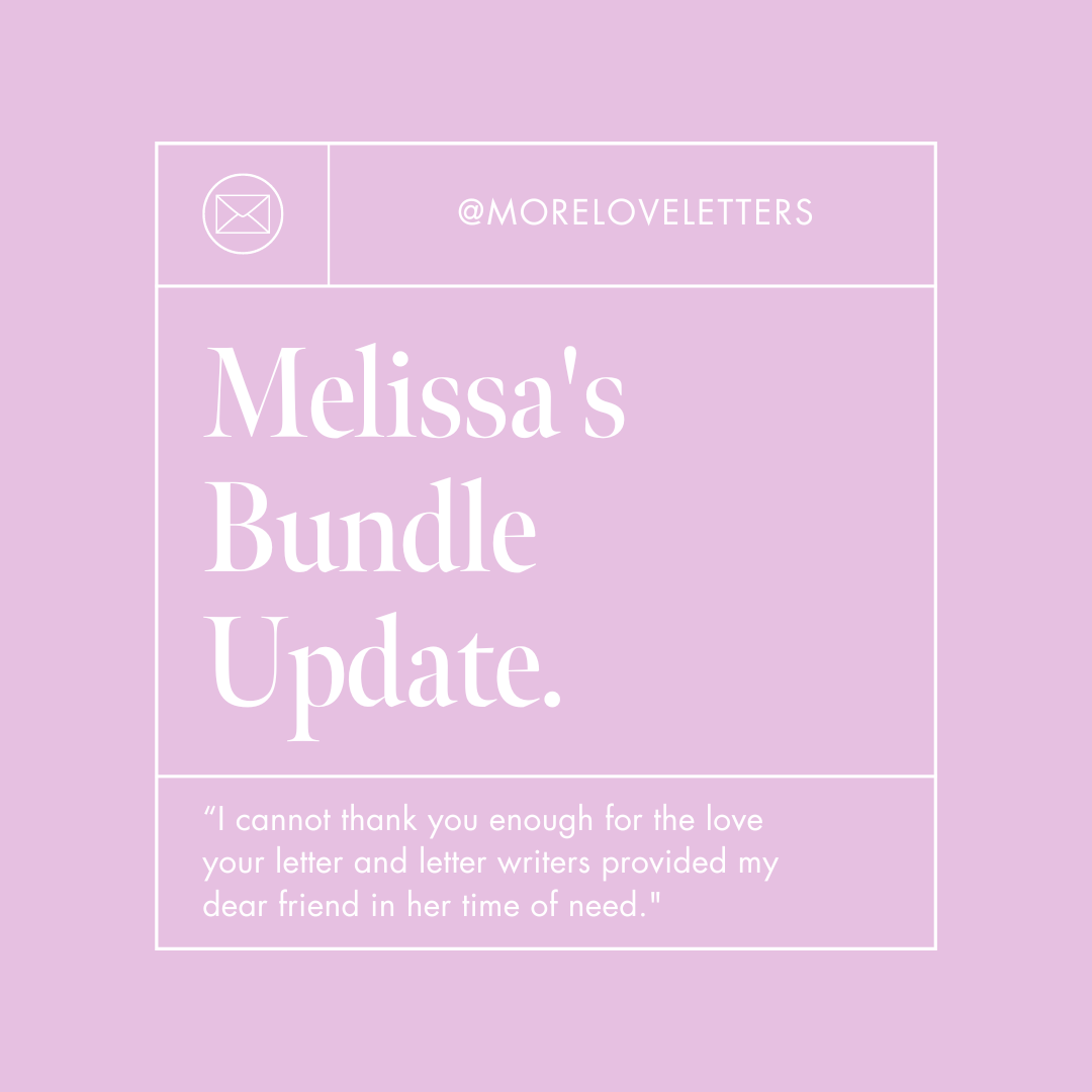 I will forever be grateful to each and every person who reached out. I will forever be grateful to the good works your organization provides…Melissa has made it clear how deeply helpful the letters have been and I am forever grateful to you for helping ease some of her pain. Much love and my deepest gratitude!”